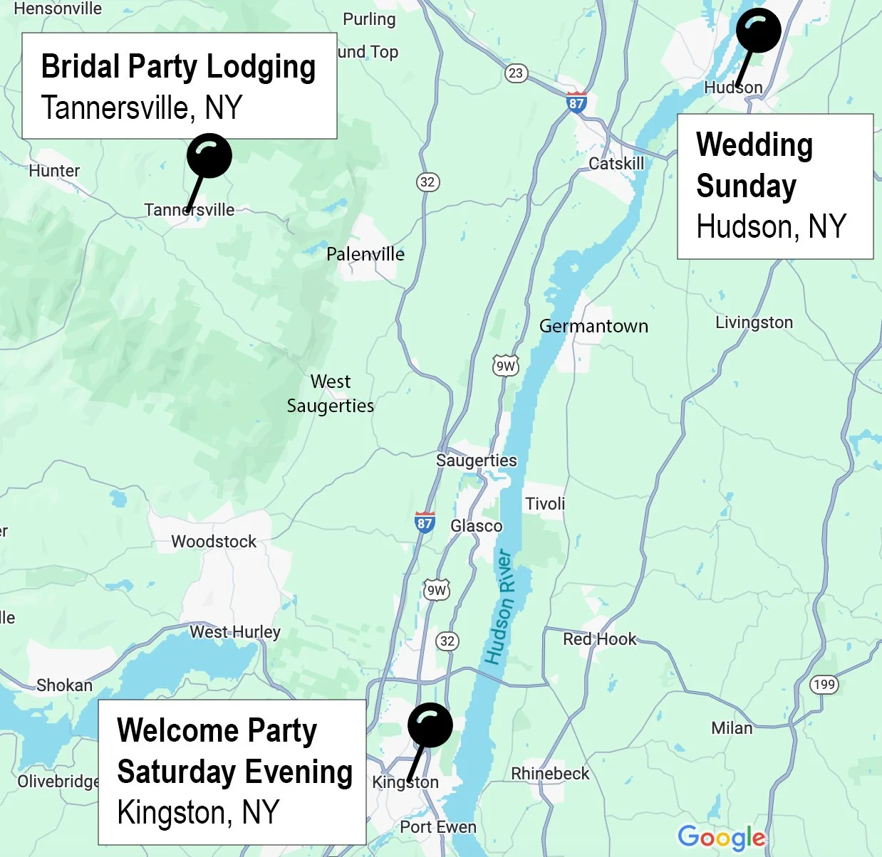 The wedding on Sunday will be in Hudson, NY, and Saturday night’s welcome party will be in Kingston, NY (scroll to the bottom of this page to see a helpful map). Between the two are various beautiful small towns in which we have enjoyed many an adventure. We encourage you to stay in one of the various charming local B&Bs or farmstays in the area (check AirBnB or VRBO too!).